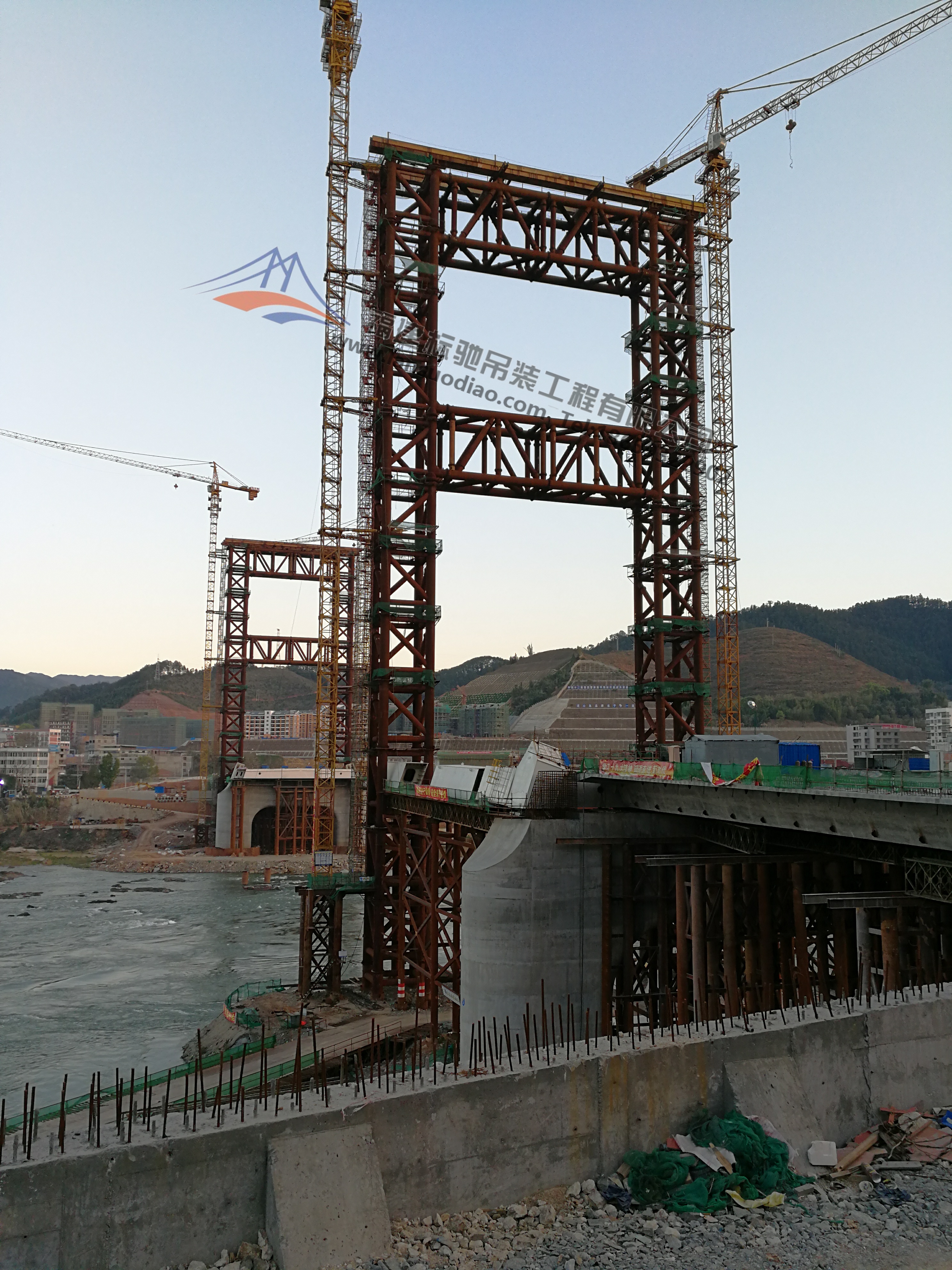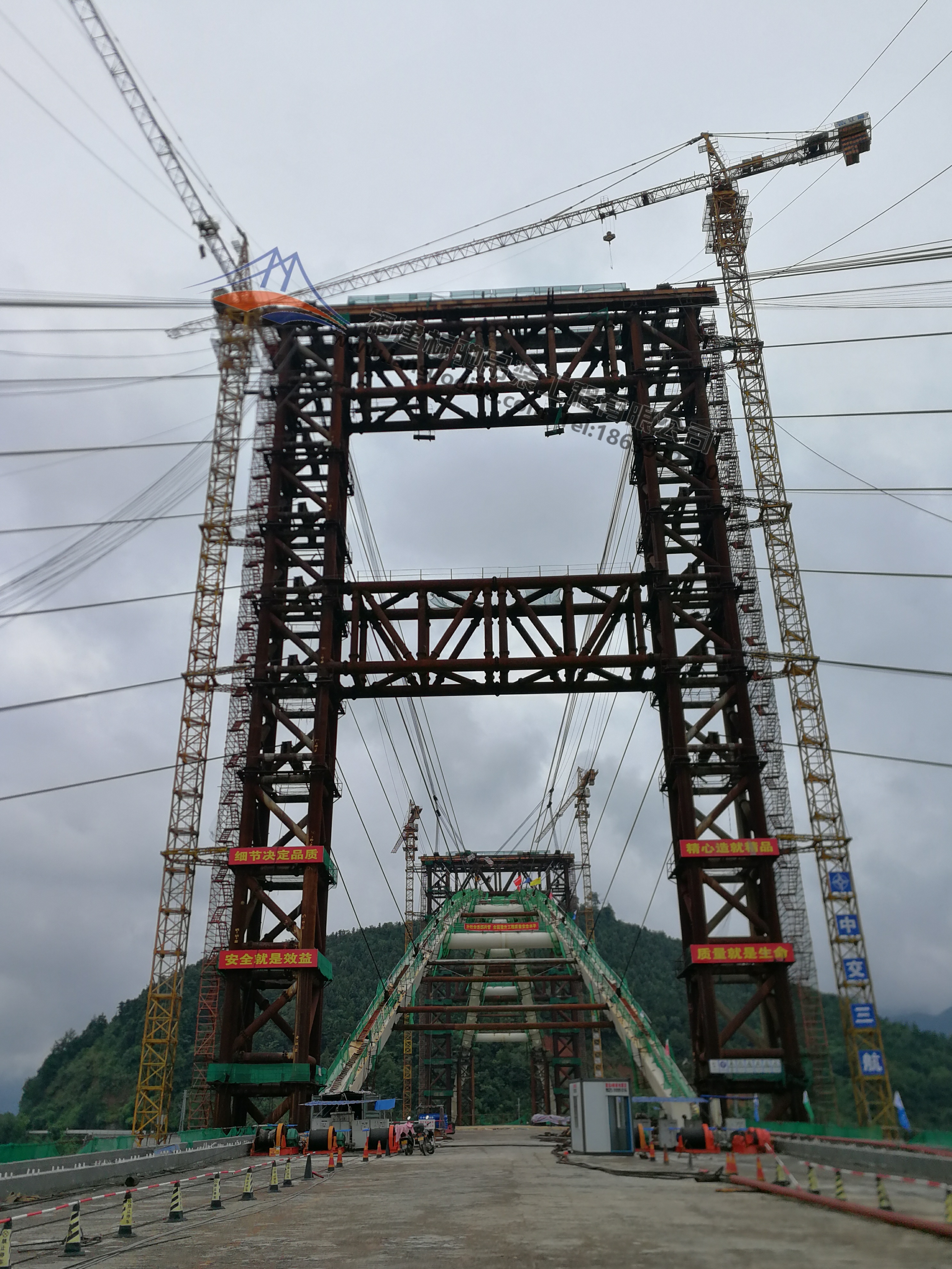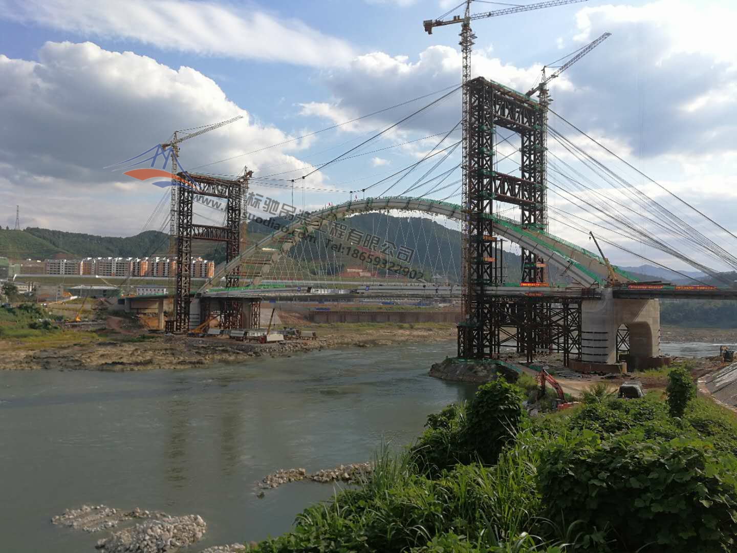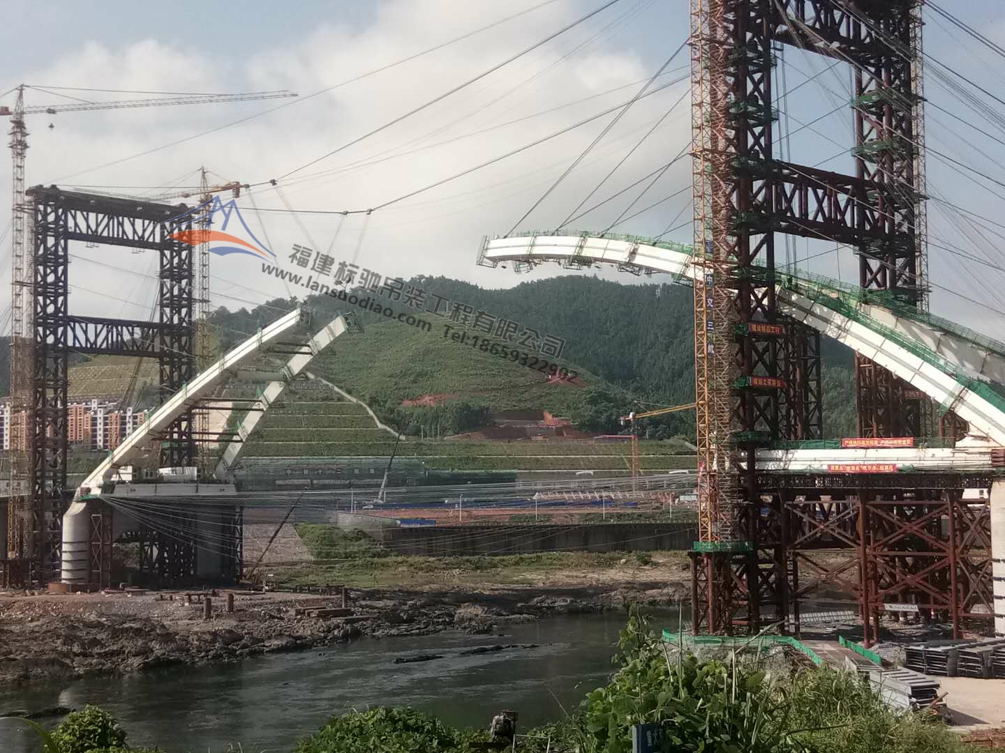 特点:受场地限制,国道岸拱脚附近区域拱肋采用“竖转+支架”方案;跨中区域拱肋采用“悬拼+斜拉扣挂”方案